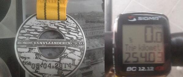 Op 5 april was het dan eindelijk zover, het trainingsschema dat ik in november voor ogen had, werd niet echt gerealiseerd. Met wel voldoende loopkilometers in de benen maar met slechts 330 fietskilometers vatte ik de Ronde aan. Om 6 uur afspraak met de groep in Roeselare om dan om 7 uur stipt te vetrekken in Brugge. Met een groep van zo’n 20 man vertrokken we voor een tocht 250 kilometer. Velen keken raar op toen ik startte, nog steeds dezelfde kledij als 12 jaar geleden en nog straffer hetzelfde materiaal als 12 jaar geleden. Ik heb de fiets inderdaad de voorbije jaren wat opzij geschoven. Iets wat ik na 5 april zeker niet meer van plan ben. Maar het materiaal was misschien wel oud maar zeker niet versleten. Achteraf bleek wel dat ik met een te groot voorblad was vetrokken. Absoluut niet ideaal bleek achteraf.